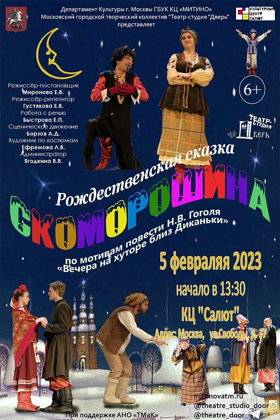 Старинные гадания, колядки и сказочная атмосфера спектакля не оставят равнодушными ни ребёнка, ни взрослого! Вас ждут встречи с кузнецом Вакулой и прекрасной Оксаной, Чубом и Паном Головой, Дьяком и Солохой. Шутки и скоморошьи прибаутки заставят вас смеяться, а черти и ведьмы окунут в мир волшебства.
