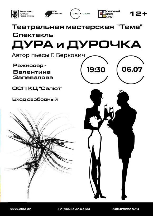 Уважаемые жители района Южное Тушино! 6 июля в 19:30 в культурном центре "Салют" по адресу улица Свободы, дом 37 покажут спектакль "Дура и дурочка".