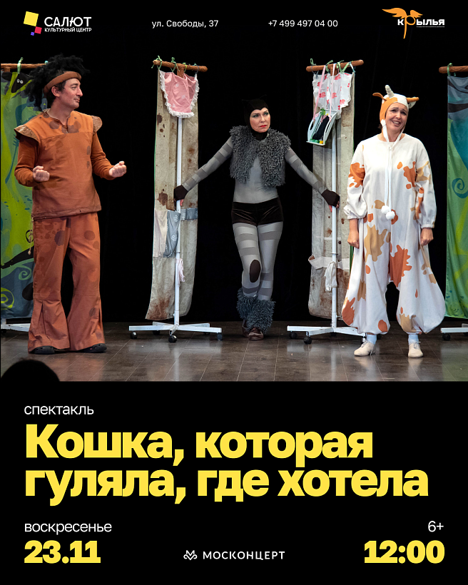 А произошло это еще в ту далекую пору, когда Ручные Животные были Животными Дикими. Собака была дикая, и Лошадь была дикая, и Корова была дикая, – и все они были дикие-предикие и дико блуждали по Мокрым и Диким Лесам. Но самая дикая была Дикая Кошка – она бродила, где вздумается, и гуляла сама по себе. Кошка была самой хитрой и поэтому, когда женщина приручала животных — кошку приручать не стала. И гуляла кошка сама по себе, свободная и ждала, когда же и её приручат… Все герои спектакля — это звери, но пьеса конечно не о зверях, а о людях.
