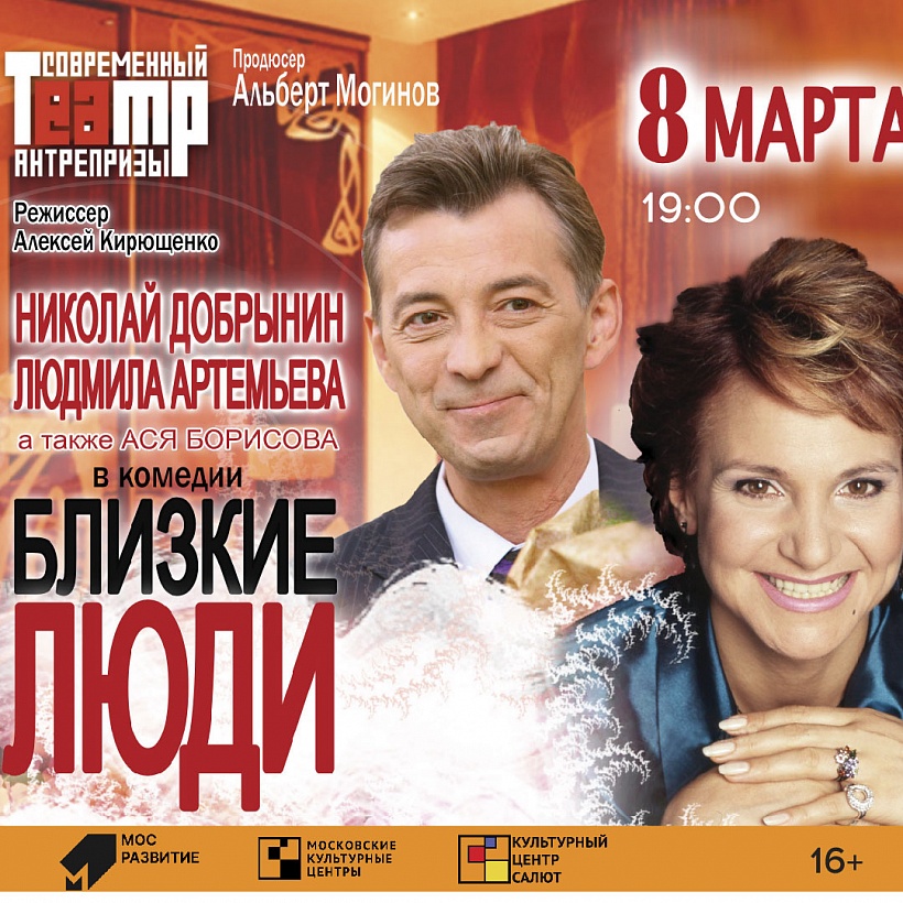 Спектакль «Близкие люди» 08.03.2021 19:00 Спектакль «Близкие люди» (комедия) с участием актеров: Людмилы Артемьевой, Николая Добрынин и Аси Борисовой. Аудитория 16+ Вход по билетам. Купить билет