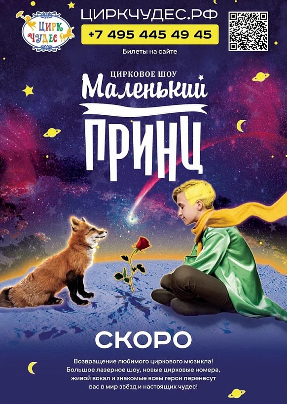 Это уникальный спектакль, представляющий собой синтез разнообразных жанров. Сочетание в одной программе большого циркового, мультимедийного, лазерного, музыкального и интерактивного шоу удивляет и вызывает восторг у зрителей всех возрастов. Гостей цирка ждёт встреча с любимыми героями и новые приключения героев книги Антуана де Сент-Экзюпери. Звёздный мальчик с золотыми волосами, трогательная и прекрасная Роза, верный Лис, необычные обитатели далёких астероидов… Все они уже скоро появятся на сцене Цирка Чудес, чтобы открыть для Вас новую вселенную: вселенную настоящих чудес, уникальных трюков и потрясающих песен.