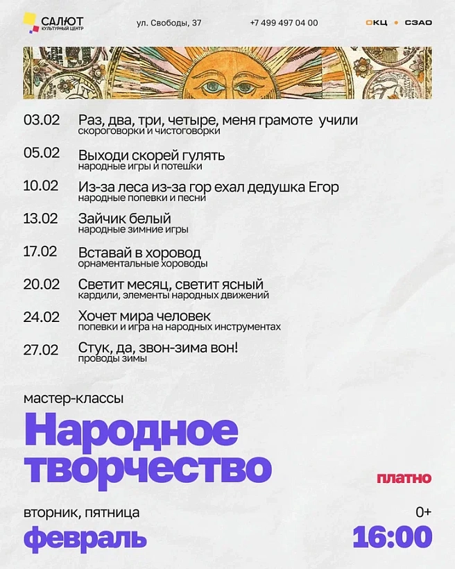 Игры, песни, хороводы и народные традиции - приглашаем на цикл увлекательных занятий, где дети познакомятся с живым русским фольклором через движение, слово и музыку.