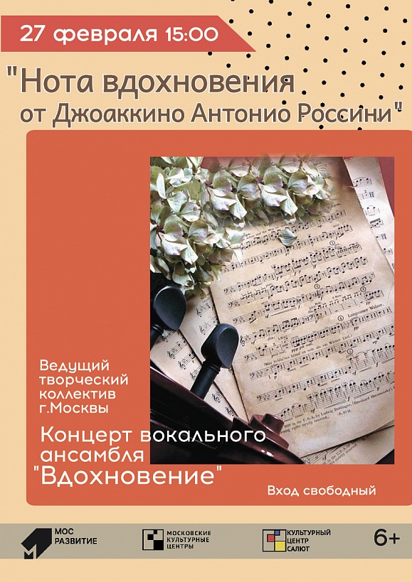 Конец зимы ознаменуется очередным концертом вокального ансамбля "Вдохновение". На этот раз артисты подготовили для зрителей арии и романсы из произведений итальянского композитора. Такой выбор не случаен: в феврале этого года Россини исполняется 228 лет со дня рождения.