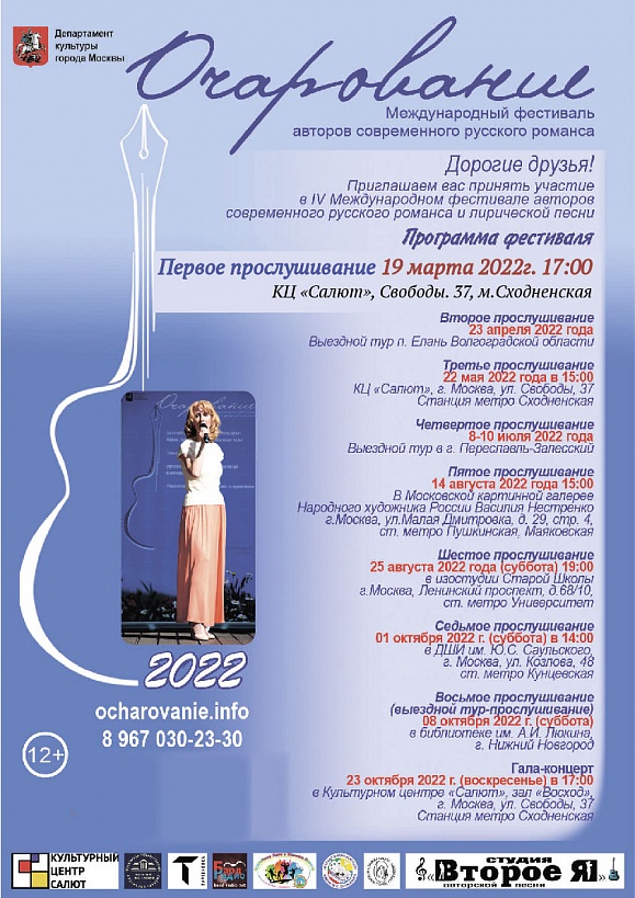 Приглашаем авторов принять участие в пятом Международном фестивале авторов современного русского романса и лирической песни "Очарование". Международный благотворительный фестиваль авторов современного русского романса и лирической песни «Очарование», в дальнейшем – Фестиваль, организуется и проводится в целях сохранения и популяризации уникального явления русской культуры – современного русского авторского романса. Фестиваль проводится в Москве и других городах в несколько этапов – концертов: