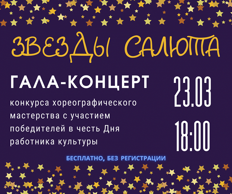 Гала-концерт с участием финалистов конкурса хореографического мастерства и эстрадного вокала состоится в 18:00 23.03 в Культурном центре "Салют". Концерт приурочен ко Дню работника культуры (который ежегодно отмечается в России 25 марта). Вход на концерт - бесплатный, регистрация не требуется, ведь концерт пройдет в большом зале "Восход", где места хватит всем!