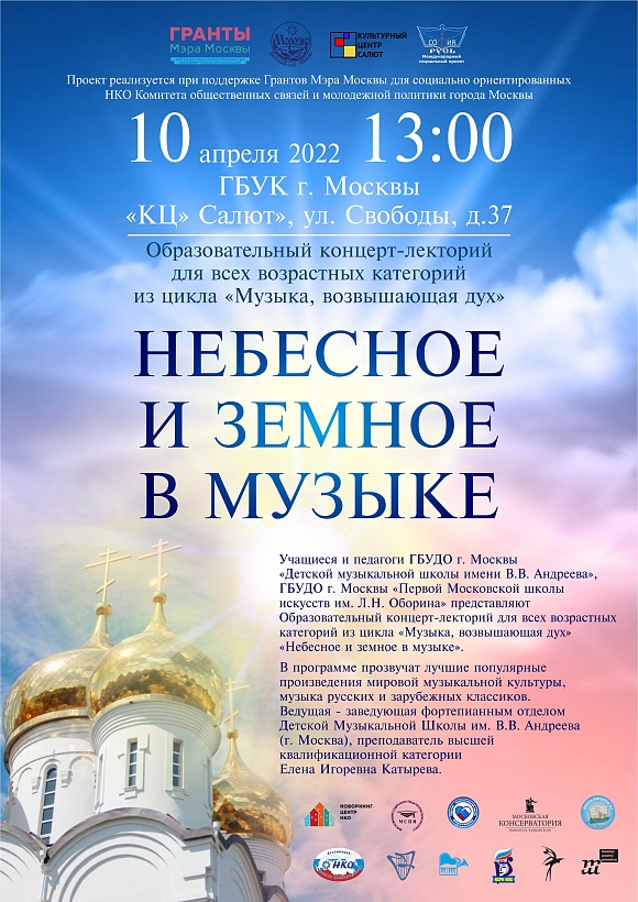 10-15 учащихся и педагогов ГБУДО г. Москвы «Детской музыкальной школы имени В.В. Андреева», ГБУДО г. Москвы "Первой Московской школы искусств им. Л.Н. Оборина" представляют Образовательный концерт-лекторий для всех возрастных категорий из цикла «Музыка, возвышающая дух» «Небесное и земное в музыке».