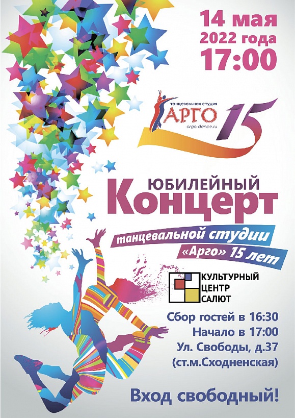 Концерт приурочен к празднованию 15 летия танцевальной студии Арго. Юбилейное мероприятие состоит из театрализованных танцевальных номеров с участием действующих танцоров студии от 3 до 18 лет и мастер классов от хореографов. Будут показаны любимые и титулованные номера студии. Кроме того, свое мастерство покажут лучшие выпускники, которые продолжили свое развитие на профессиональном уровне. На праздник приглашены тренеры и дружественные коллективы по различным направлениям танца от бальных до джаз модерна и хип-хопа. Особую атмосферу создадут вокальные выступления и комбинация живого исполнения песен и танцев. Мероприятие бесплатное для всех желающих!