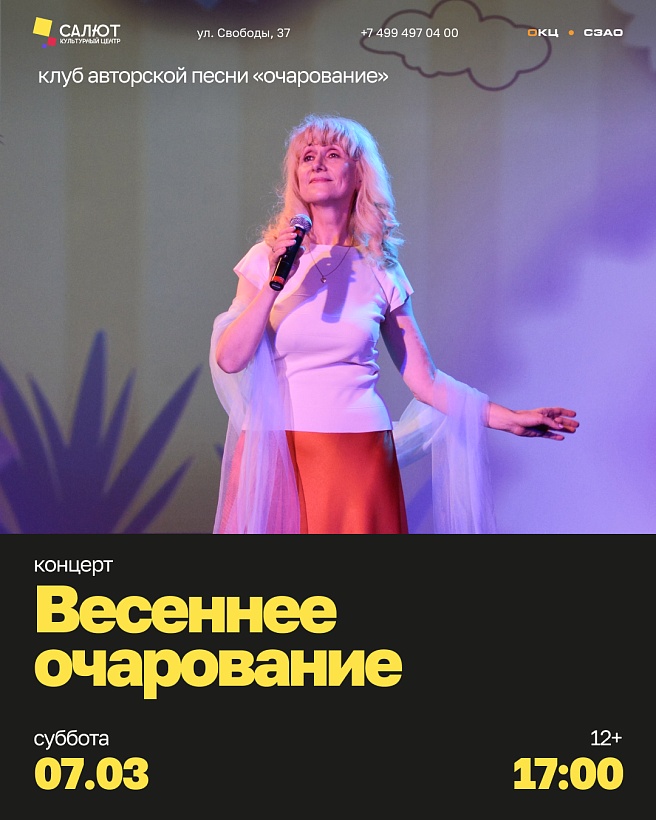 Клуб авторской песни «Очарование» и его руководитель - Елена Дарина - приглашают зрителей на концерт «Весеннее очарование».
