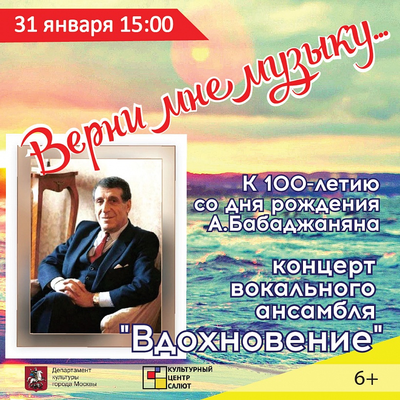 31 января в память о композиторе артисты вокального ансамбля "Вдхновение" исполнят музыку и песни Арно Бабаджаняна. В программе прозвучат хиты автора, которые в очередной раз смогут покорить публику своей мелодичностью, душевностью и жизнеутверждающим началом!