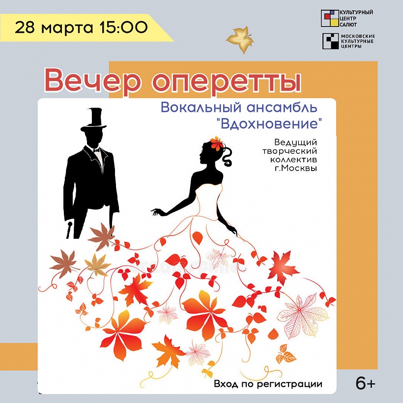 Вокальный ансамбль "Вдохновение" под руководством Алексея Ивановича Синелобова подготовил концерт "Вечер оперетты". Любителей этого жанра приглашаем насладиться сочинениями И.Дунаевского, И. Кальмана, Легара, Штрауса и других композиторов. В исполнении участников коллектива вокального ансамбля прозвучат известные произведения этих и других авторов. Всех желающих приглашаем посетить воскресное мероприятие!