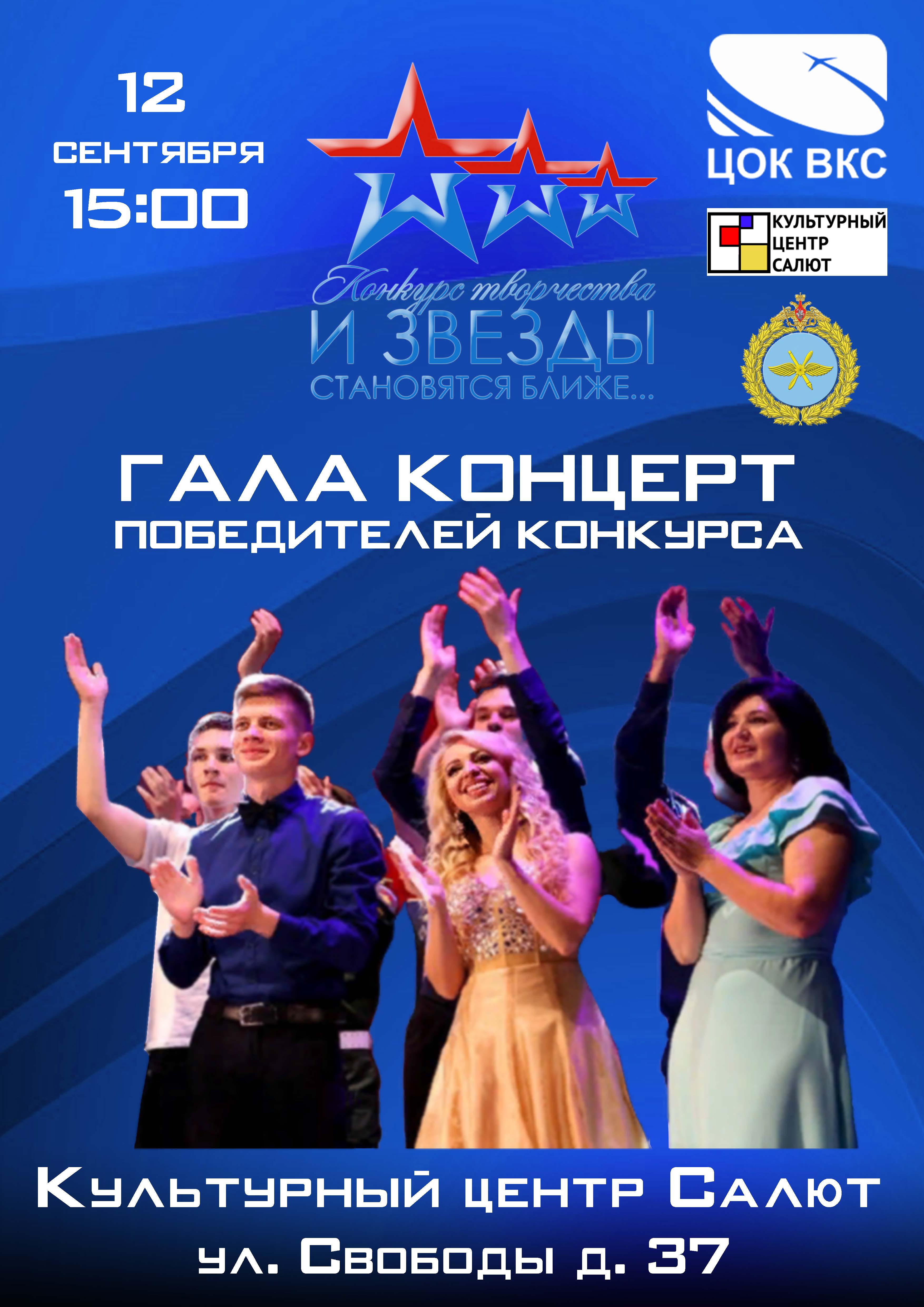 12 сентября 2020 г., в 15:00 в Концертном зале «Восход» Культурного центра «Салют» пройдет Гала-концерт пятого творческого конкурса «И звезды становятся ближе…» для военнослужащих Военно-космических сил, ветеранов войны и военной службы и членов их семей.