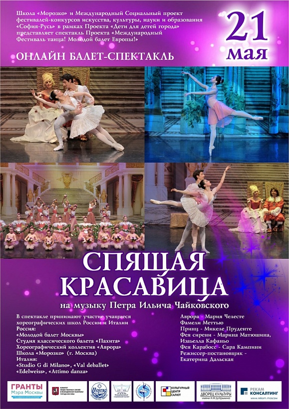 Школа «Морозко» и Международный Социальный Проект фестивалей-конкурсов культуры, искусства, науки и образования «София-Русь», в рамках Проекта «Дети для детей города», при поддержке Грантов Мэра Москвы, представляет Вашему вниманию балет «Спящая Красавица». Постановка балета-спектакля «Спящая Красавица» стала первым опытом нашего Проекта в создании уникальных совместных спектаклей, в которых участвовало одновременно от 100 до 150 юных артистов из различных хореографических студий и школ России и Италии. Каждый коллектив репетировал свою часть (отрывок из балета) у себя на родине, на своей сценической площадке, а затем уже в Москве, в невероятно короткие сроки, в результате огромного труда и сотрудничества российских и итальянских педагогов, а также благодаря четкой, отлаженной работе команды организаторов был собран каждый кусочек воедино.
