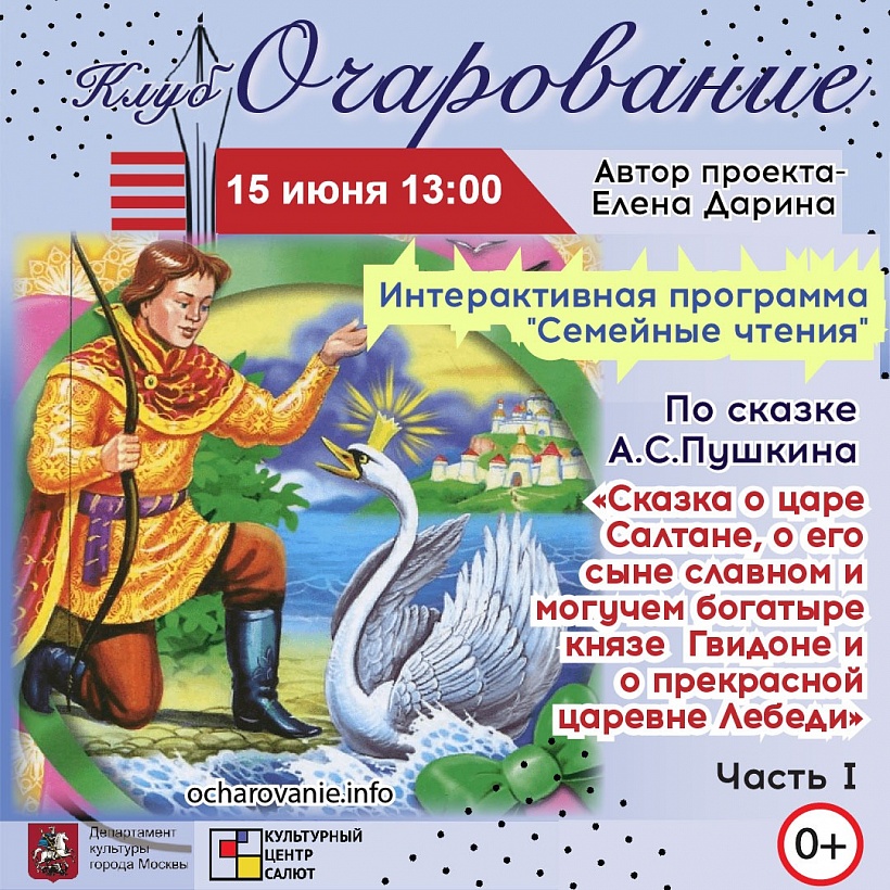 15 июня в 13:00, премьера 1 части видео-книги по сказке Александра Сергеевича Пушкина «Сказка о царе Салтане, о его сыне славном и могучем богатыре князе Гвидоне Салтановиче и о прекрасной царевне Лебеди».