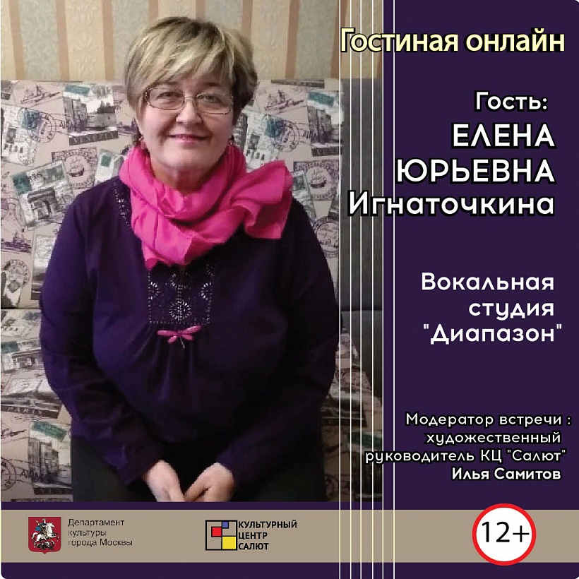 Очередная встреча в нашей онлайн гостиной пройдет в компании с руководителем студии эстрадно-джазового вокала "Диапазон" Игнаточкиной Еленой Юрьевной Instagram @ignato4kina555 - специалистом с большим педагогическим стажем. Поговорим об особенностях преподавания и работы со взрослой аудиторией, в том числе в рамках проекта "Московское долголетие". О том, что в планах на предстоящий творческий сезон в Культурном центре "Салют" и, конечно, ответим на вопросы в комментариях.