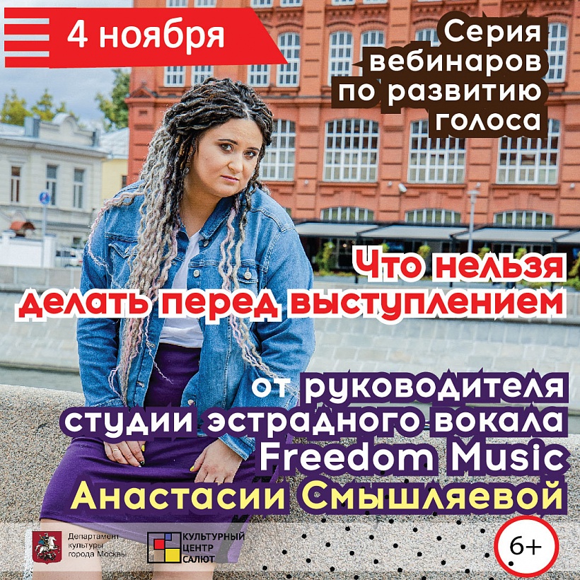 С 3 по 5 ноября Культурный центр "Салют" и Анастасия Смышляева проведет серию вебинаров по развитию голоса на YouTube-канале Культурного центра «Салют».