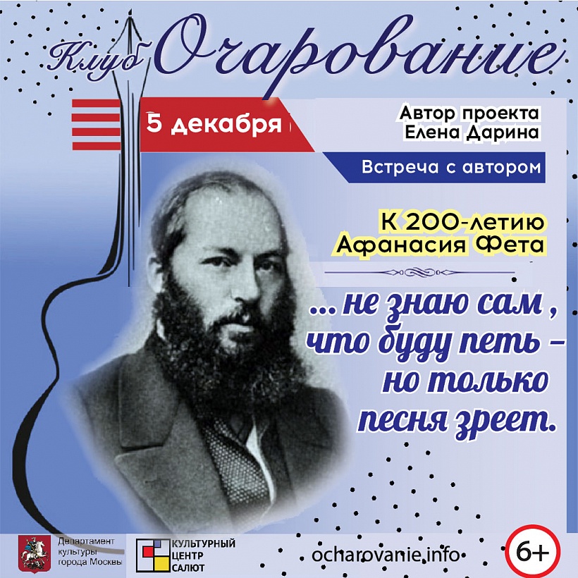 Клуб авторской песни «Очарование» приглашает зрителей на встречу с авторами, написавшими песни на стихи Афанасия Фета.