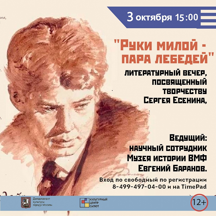 О творчестве великого поэта и его необычной судьбе простого юноши из деревни, наделенного недюжинным поэтическим даром расскажет научный сотрудник Музея истории ВМФ Евгений Баранов. Зрители не только узнают много нового о жизни поэта, но и услышат песни и стихи Сергея Есенина в исполнении ведущего.