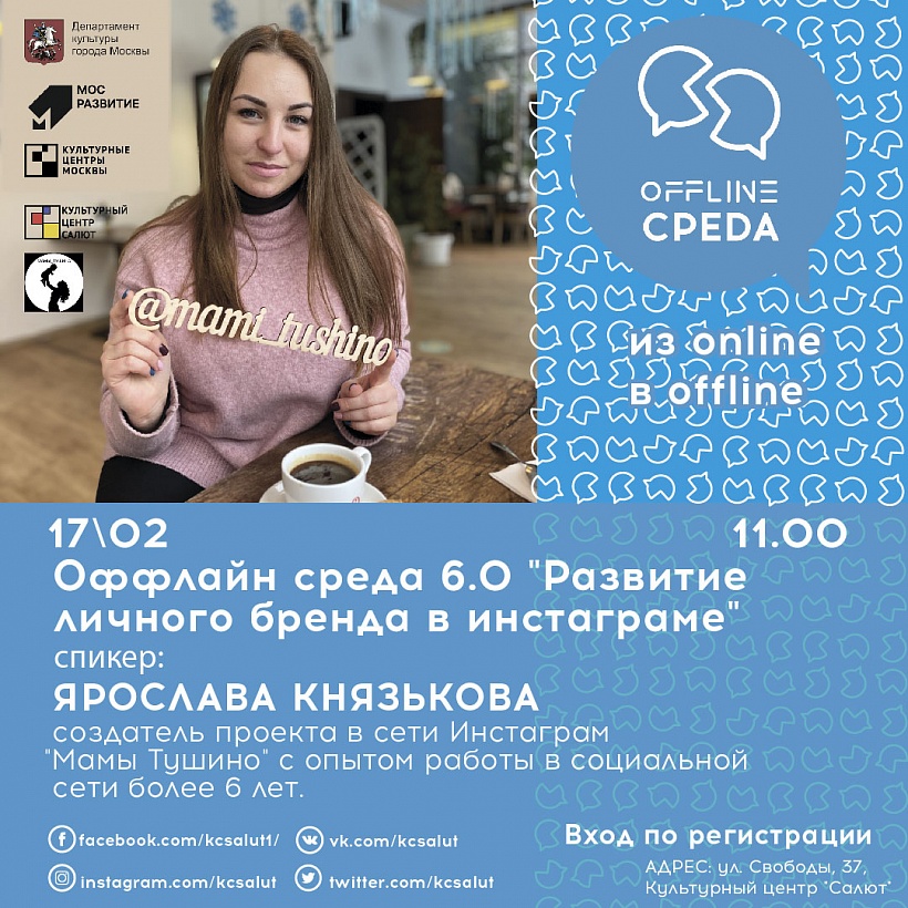 В рамках сетевой акции "Оффлайн среда 6.0" в этот раз мы встретимся с Ярославой Князьковой, создательницей проекта в сети Инстаграм "Мамы Тушино" с опытом работы в социальной сети более 6 лет.