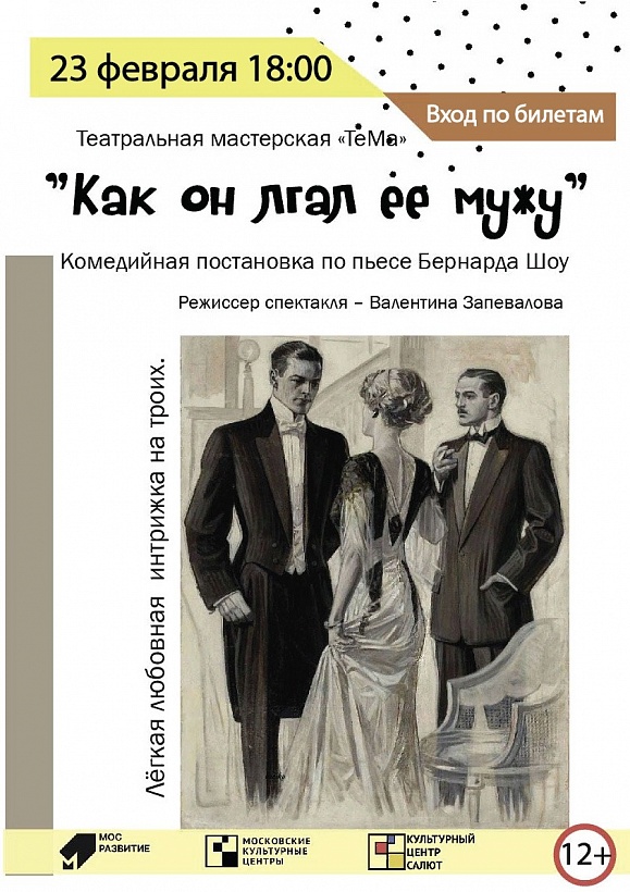 Театральная мастерская "ТеМа" представляет зрителю свою новую комедийную постановку по пьесе Бернарда Шоу "Как он лгал её мужу".
