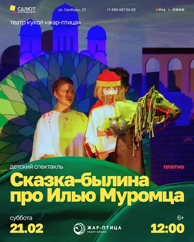 Спектакль о силе духа, мужестве и славе русского богатыря Ильи Муромца создан на основе литературных произведений, народных праздников и песнопений. Постановка раскрывает историю рождения, становления и подвигов легендарного героя, знакомя юных зрителей с героическим прошлым нашей страны.