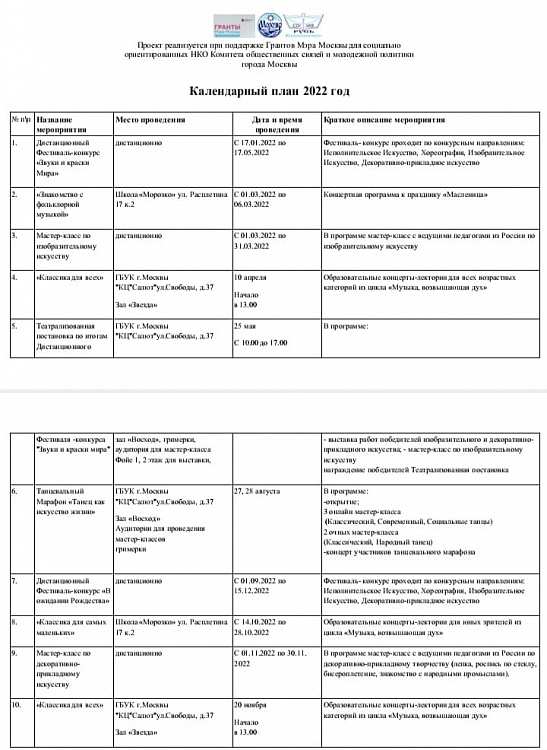 В течение года в рамках Международного Проекта будут проходить не только фестивали-конкурсы, но и обучающие семинары, мастер-классы, краткосрочные курсы повышения квалификации для педагогов, круглые столы по обмену опытом, конференции, благотворительные концерты с участием известных людей культуры, искусства, литературы, образования и науки.