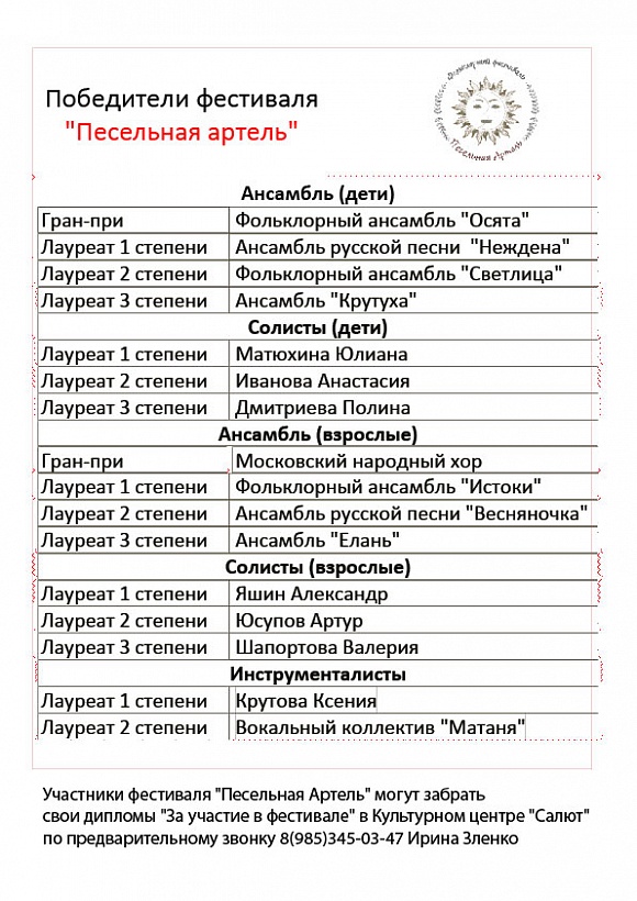 Итоги конкурса "Песельная Артель" 29.09.2020 Объявляем победителей открытого фестиваля "Песельная Артель", который прошел в КЦ "Салют" 26 сентября 2020 г. Благодарим всех участников и руководителей коллективов за прекрасные выступления и подготовленность.